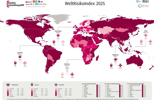 Philippinen erneut Risikospitzenreiter Der aktuelle WeltRisikoIndex bewertet das Katastrophenrisiko von allen 193 UN-Mitgliedsstaaten. Auch 2025 liegen die globalen Risikohotspots in Asien und Lateinamerika. Deutschland liegt wie im Vorjahr im globalen Mittelfeld.
