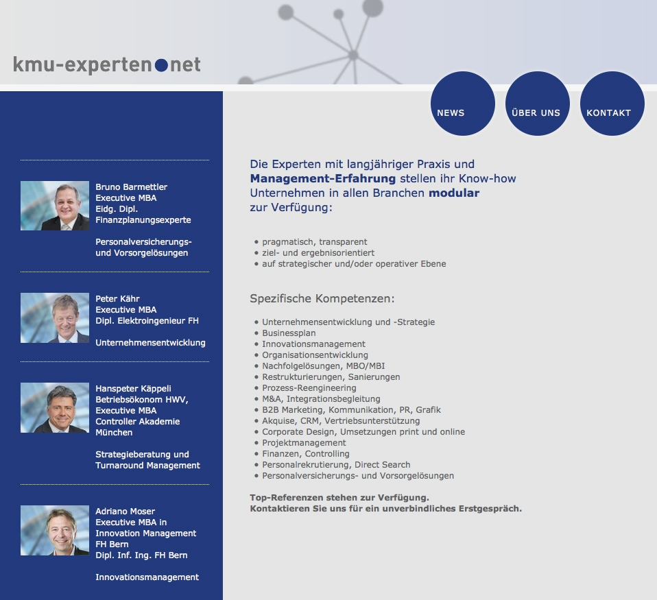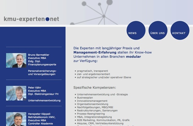 Das seit 2009 bestehende Experten-Netzwerk hat sich auf die Fahne geschrieben, mittelgrosse Unternehmen fundiert und praxisnah zu unterstützen. Auf dem Hintergrund einer breit gefächerten Beratungsexpertise generiert das Netzwerk Denkanstösse, Möglichkeiten und Lösungen und agiert als kritischer Sparringpartner für den Kunden. Alle Experten verfügen über langjährige unternehmerische Berufserfahrung. Unter www.kmu-experten.net präsentieren sich Spezialisten mit generalistischem Hintergrund. Die Experten sind in Wirtschaft und Gesellschaft hervorragend vernetzt. Praxisnahes Denken, hohe Glaubwürdigkeit und der Fokus auf kleinere und mittelgrosse Unternehmen bieten eine gute Ausgangslage für eine effiziente und ergebnisorientierte Dienstleistung. Allen Experten ist gemeinsam, dass sie über eine mehrjährige Berufs- und Beratungspraxis in ihrem Fachgebiet wie auch über einen Hochschulabschluss verfügen. Dieser Qualitätsstandard ist das herausragende Merkmal von www.kmu-experten.net. Den Kunden steht es frei, Leistungen von einem einzelnen Experten oder - je nach Bedarf - von mehreren Experten zu beziehen.