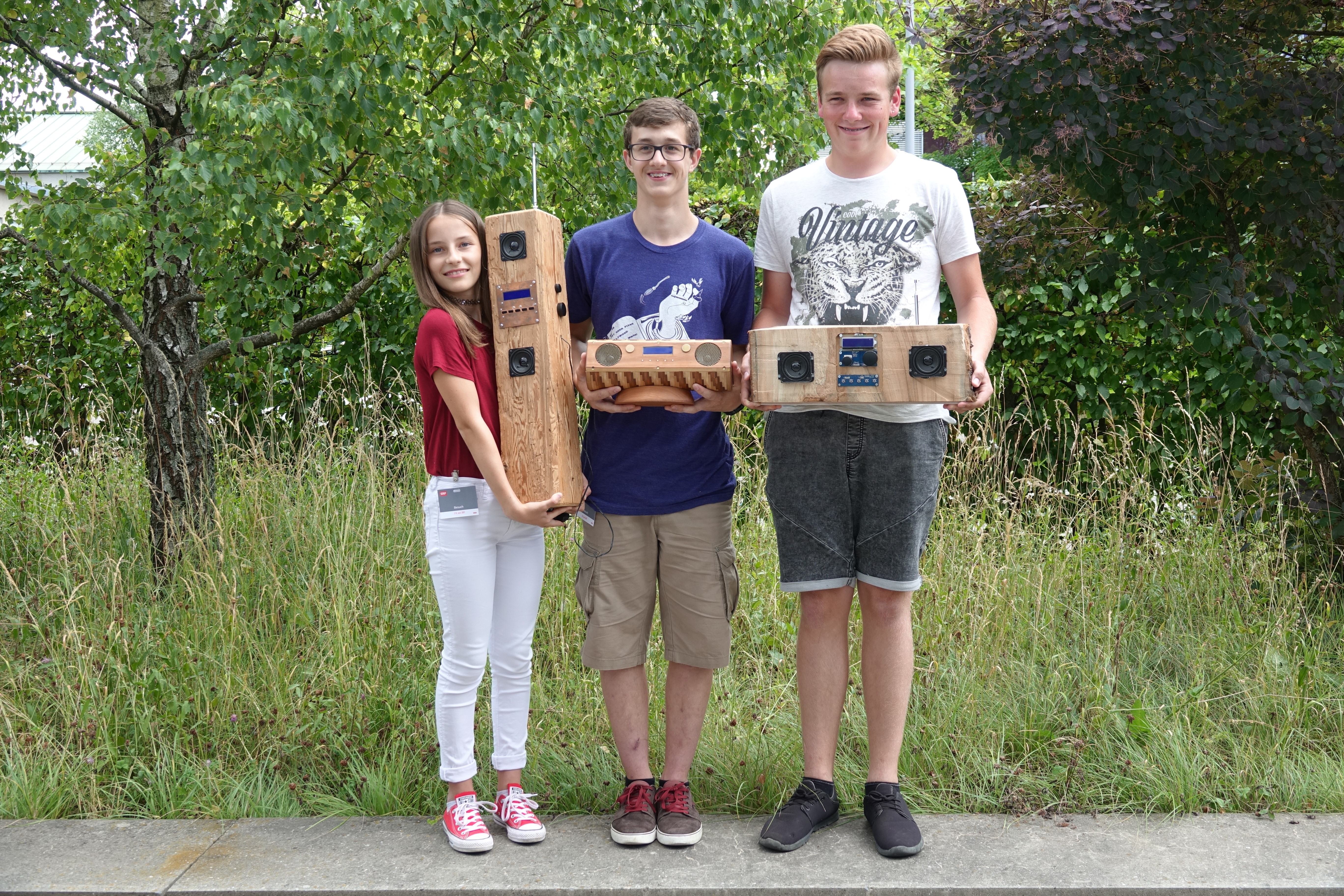 Rund 70 Stunden hat der Wettbewerbsgewinner der Deutschschweiz, Pascal Oeschger, Steinhausen, Klasse S2B von Lehrer Iwan Hänni, in sein selbst gebautes DAB+ Radio investiert: «Es hat grossen Spass gemacht, dieses individuelle Radio herzustellen.» Der künftige Schreiner hat keinen Aufwand gescheut und zusätzlich eine persönliche Dokumentation erstellt, in der er den Prozessablauf festhielt - zum Beispiel fünf Stunden schleifen und präzises Ausrichten der einzelnen Holzelemente. Die Zweitplatzierte, Jessica Thurnherr aus Altstätten (SG), Klasse S3A von Guido Poznicek, hat für ihr Radio ebenfalls Holz als Gehäuse gewählt. Auf die Idee gebracht hat die künftige Fachfrau Gesundheit ihr Vater. Er entdeckte zu Hause einen alten Holzbalken. Aus Holz ist auch das Radio von Raphael Jost aus Kölliken (AG), Klasse 4. Sek., Lehrer Toni Möri. Der angehende Baumaschinenmechaniker-Lernende wählte für sein DAB+ Radio einen Teil eines Baumstammes aus. Lehrer Toni Möri ergänzt: «Einen Motivationsschub bekam diese Werkarbeit, als jeweils das erste DAB+ Radio in der Schulwerkstatt erklang.»