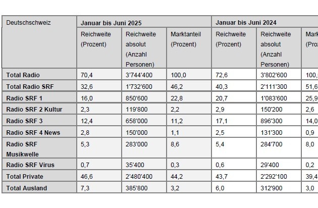 Im ersten Halbjahr 2025 verzeichnete Radio SRF einen Marktanteil von 46,2 Prozent und bleibt damit Marktführer in der Deutschschweiz. Das entspricht einer absoluten Reichweite von täglich 1,7 Millionen Personen. Im Vergleich zum Vorjahreshalbjahr ist der Marktanteil der SRF-Radios um 5,5 Prozentpunkte im Rahmen der Erwartungen zurückgegangen. Radio SRF 1, Radio SRF 2 Kultur und Radio SRF 3, die bis Ende 2024 noch via UKW verbreitet wurden, sind am stärksten vom Rückgang betroffen. Trotzdem bleiben Radio SRF 1 mit 22,8 Prozent Marktanteil und Radio SRF 3 mit 11,2 Prozent Marktanteil die meistgehörten Radioprogramme der Deutschschweiz.