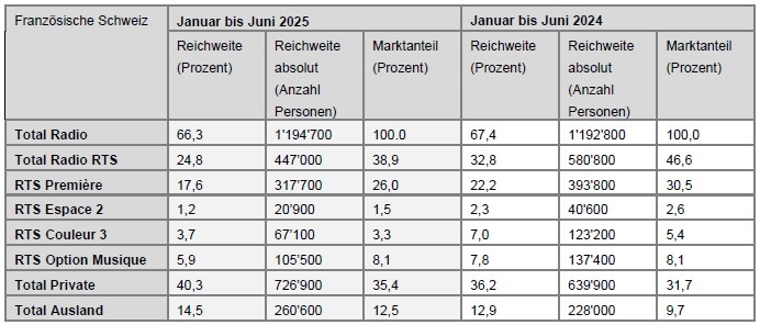 Der Marktanteil der RTS-Radios ist im Vergleich zum Vorjahreshalbjahr insgesamt um 7,7 Prozentpunkte auf 38,9 Prozent im Rahmen der Erwartungen zurückgegangen. RTS Première weist einen Marktanteil von 26,0 Prozent, Radio RTS Espace 2 1,5 Prozent, RTS Couleur 3 3,3 Prozent und RTS Option Musique 8,1 Prozent auf.