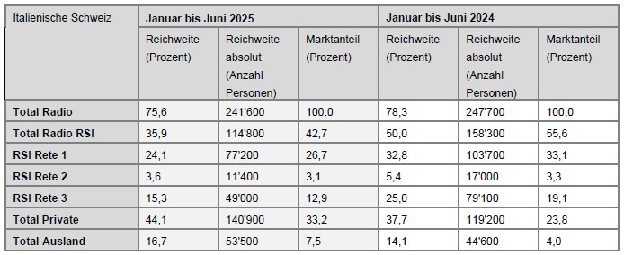 Der traditionell sehr hohe Marktanteil der RSI-Radioprogramme ist im Vergleich zum Vorjahreshalbjahr insgesamt um 13 Prozentpunkte auf 42,7 Prozent zurückgegangen. Die Präsenz der ausländischen UKW-Sender lassen die tägliche Reichweite bei RSI Rete 1 auf 77'200, bei RSI Rete 2 auf 11'400 und bei RSI Rete 3 auf 49'000 sinken.
