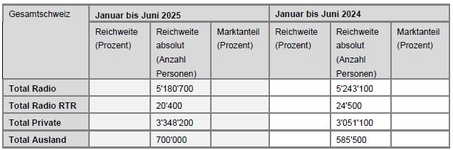 Die Reichweite des Mediums Radio allgemein nimmt ab, da sich das Mediennutzungsverhalten bereits seit einiger Zeit verändert. Der Verlust von minus 7 Prozentpunkten (-14 Prozent) bei der Nettoreichweite der SRG-Sendergruppe im Vergleich zum gleichen Semester 2024 entspricht der erwarteten Entwicklung aufgrund dieser Reichweitenverluste des Mediums und der UKW-Abschaltung.