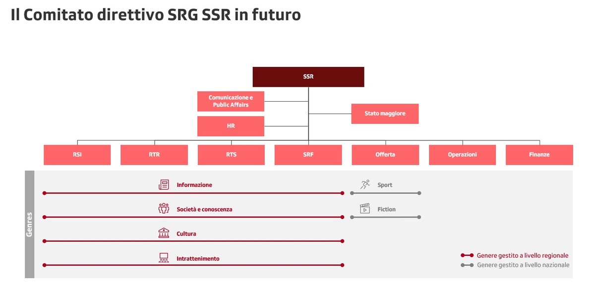 La SSR intende continuare a offrire programmi di elevata qualità capaci di raggiungere tutti i gruppi della popolazione; allo stesso tempo, però, deve far fronte a una significativa riduzione delle risorse finanziarie. A tal fine, si riorganizza e si trasforma in modo radicale. Lo scorso giugno, il Comitato direttivo SSR ha comunicato come intende affrontare questa profonda trasformazione (La SSR si riorganizza e compatta le forze). Nel frattempo, nell'ambito del progetto di trasformazione "ENAVANT SRG SSR", la SSR ha compiuto un primo importante passo per concretizzare questi piani: ha definito la futura struttura organizzativa, adeguato la struttura gestionale e concretizzato la riduzione dei posti di lavoro.