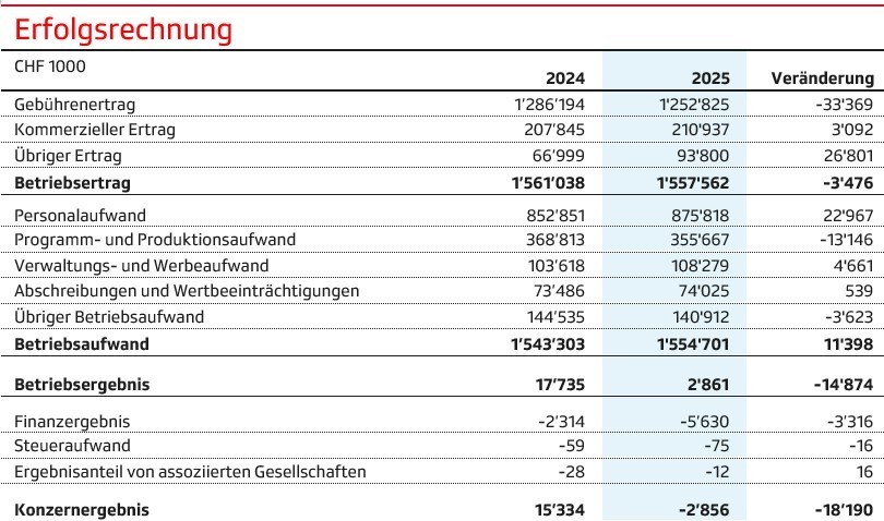 Die SRG erwirtschaftete 2025 einen Betriebsertrag von 1,56 Milliarden Franken und schloss das Jahr mit einem Verlust von 2,9 Millionen Franken ab. Der Ertrag aus der Medienabgabe ist im Vergleich zum Vorjahr um 33,4 Millionen Franken gesunken. Der reine Werbeertrag liegt 4,1 Millionen Franken unter dem Vorjahreswert. Der Rückgang konnte im Berichtsjahr jedoch durch Sponsoringeinnahmen bei Sportgrossereignissen und dank dem ESC etwas abgefedert werden. Hingegen sind die Programmerträge - zum Beispiel durch höhere Erträge aus Weitersendungsrechten - um 7,0 Millionen Franken höher als im Vorjahr und somit der kommerzielle Ertrag insgesamt um 3,1 Millionen Franken gestiegen. Deutlich zulegen konnte auch der übrige Betriebsertrag mit plus 26,8 Millionen Franken, unter anderem im Zusammenhang mit Dienstleistungen rund um die Übertragung des ESC sowie dank eines Immobilienverkaufsgewinns.
