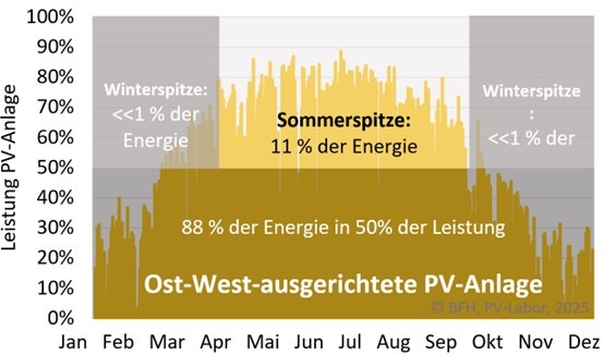 Die Grafik (vgl. Beilage) zeigt am Beispiel einer typischen Ost-West-Anlage im Mittelland, wie stark einzelne Leistungsbereiche zum Energieertrag im Sommer und im Winter beitragen.