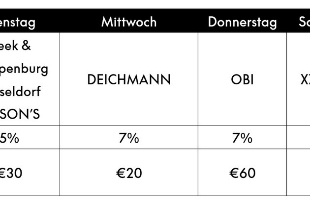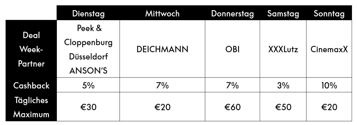 Im Rahmen der Deal Week erhalten Kund:innen bei ausgewählten deutschen Marken Cashback, wenn sie im Geschäft kontaktlos mit der PayPal-App bezahlen. An wechselnden Tagen gibt es bis zu 10 % Geld zurück. Die Aktionen wiederholen sich wöchentlich - wer regelmäßig mit PayPal vor Ort zahlt, kann so pro Monat hunderte Euro Cashback sammeln.