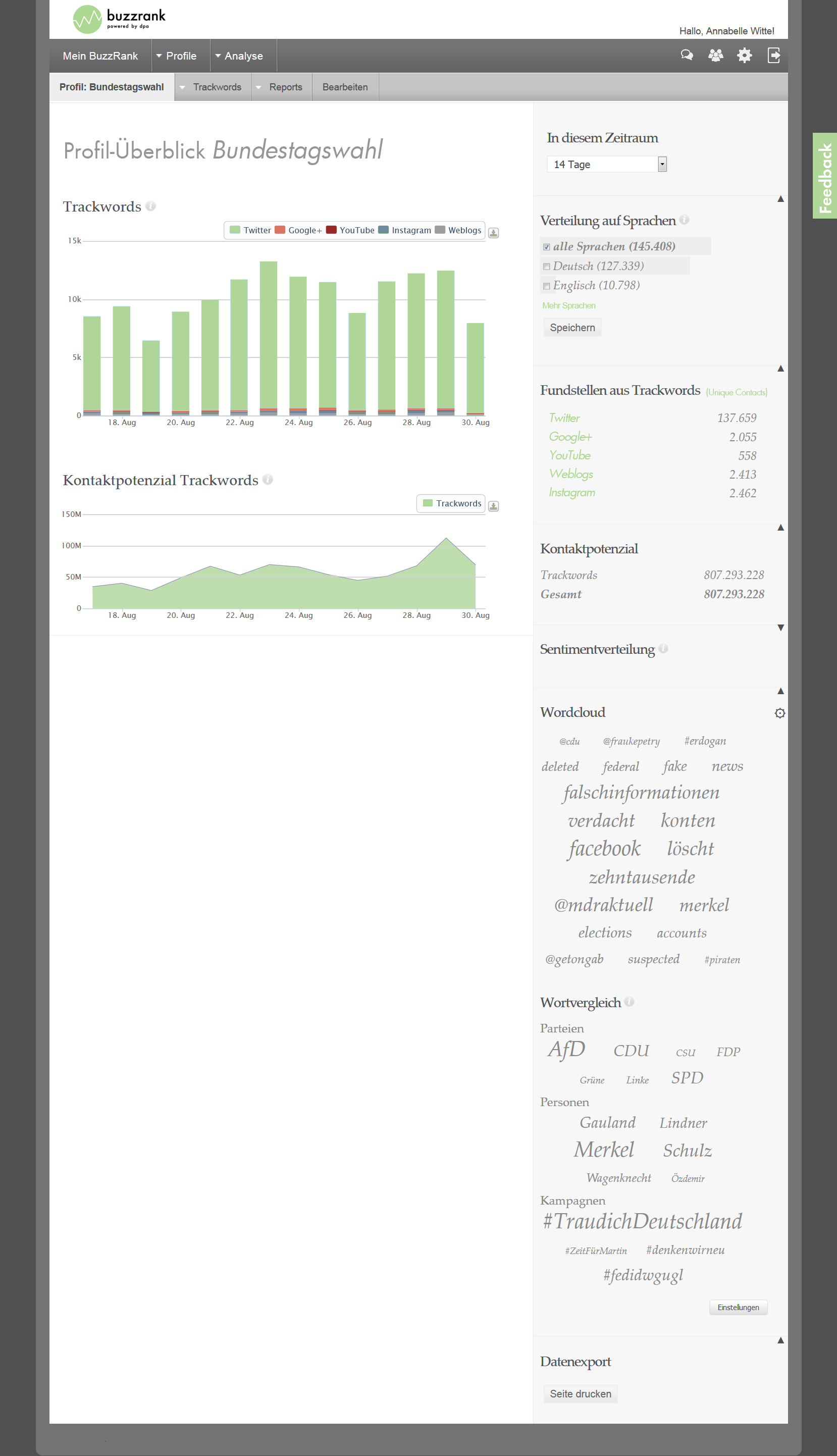 Mit der Übernahme von Buzzrank kombiniert die Deutsche Presse-Agentur ihre redaktionelle Expertise mit einer flexiblen und zukunftsweisenden Monitoring-Technologie. Buzzrank wertet Twitter, Facebook, Google+, Instagram und YouTube aus. Zusätzlich werden Blogs und Diskussionsforen nach Stichworten, Hashtags oder Wortkombinationen durchsucht. Neben umfangreichen Trefferlisten liefert Buzzrank wertvolle Informationen zu Kontaktpotenzial, Wortvergleichen und Sentimentverteilung.