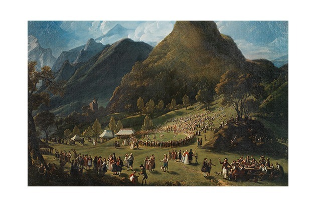 Bildnachweis: Louise Elisabeth Vigée Le Brun, La Fête des bergers suisses à Unspunnen le 17 août 1808 (Ausschnitt), 1808/1809, Öl auf Leinwand, 94 x 114 cm, Kunstmuseum Bern, Depositum der Schweizerischen Eidgenossenschaft, Bundesamt für Kultur, Gottfried Keller-Stiftung, Bern