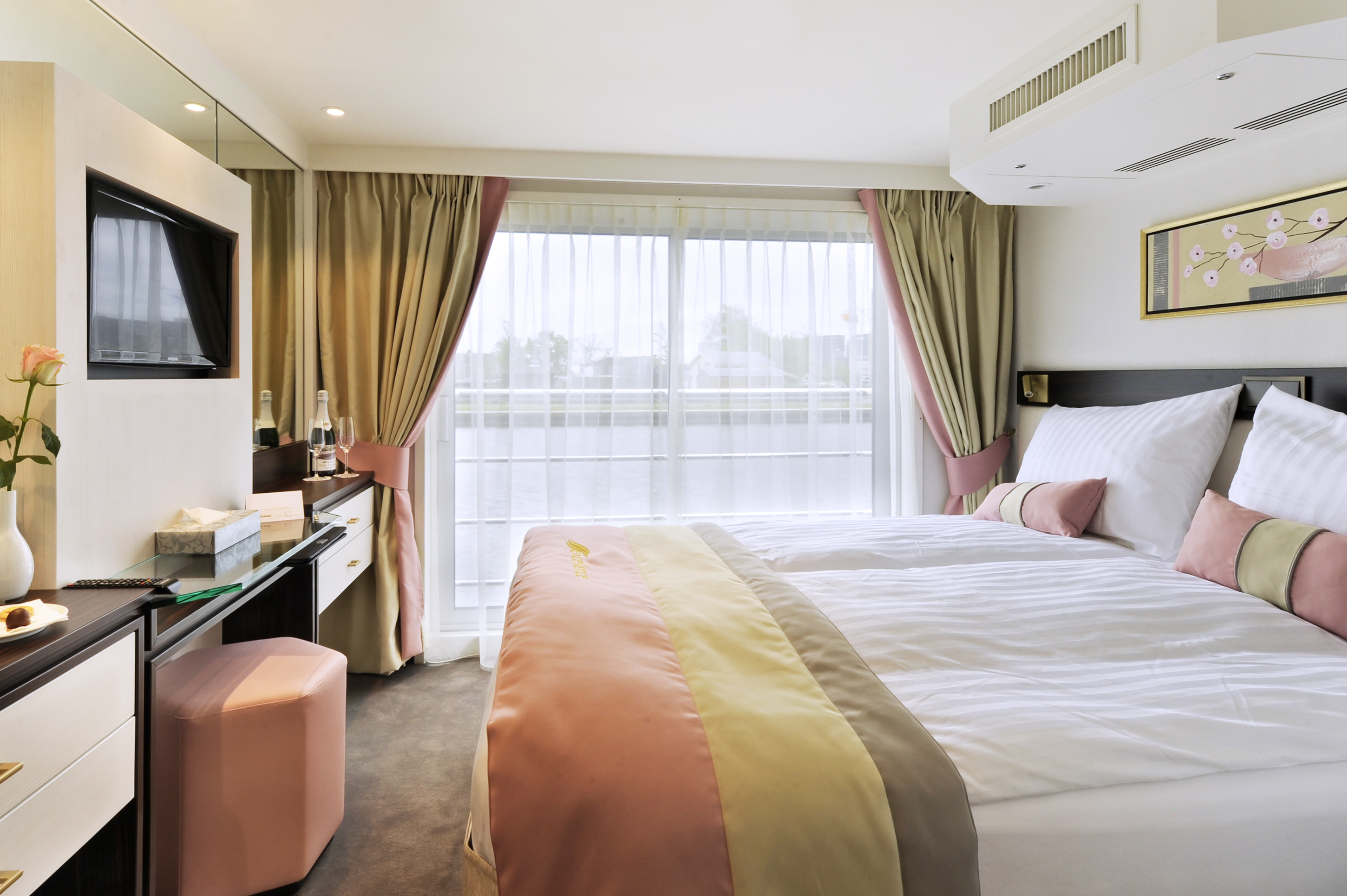 Die Excellence Pearl. Beim Umbau der ehemaligen MS Rembrandt wurden sämtliche Passagierbereiche wie Kabinen, Restaurant, Lounge und Entrée sowie Elektronik und Klimatechnik komplett neu erstellt. Die Schweizer Schiffseigner haben für ihre «kleine Perle» auf Qualität gesetzt. Bei diesem Umbau sei nichts von der Stange, alles massgefertigt, sagt VR-Präsident Karim Twerenbold. Dasselbe beim Innendesign, das wieder unter der Federführung seiner Mutter Nazly Twerenbold realisiert wurde. Weisstöne hat die Interior Designerin mit edlen Hölzern kombiniert. Puder, Rot und Eisblau, verbunden mit warmen Braun- und Gold-Tönen strahlen jetzt im Innern der Excellence Pearl.