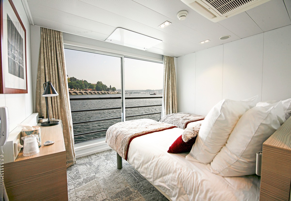 Die Miguel Torga. Die frischen Farben des Interieurs, die Gastlichkeit und die familiäre Atmosphäre an Bord der Miguel Torga schaffen Wohlgefühl. Die Räume spiegeln die Weinbautradition des Douro-Tals und die Architektur von Porto, mit Akzenten in Bordeaux-Rot, hellen Hölzern und genieteten Stahlkonstruktionen.