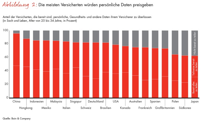 In welchem Mass die Schweizer ihre Versicherung als Partner sehen, unterstreicht ein weiteres Studienergebnis. Über 50 Prozent der Befragten erklären, dass sie ihren Versicherern ausgewählte Daten über ihre Gesundheit, ihre Finanzen oder ihre Konsumgewohnheiten bereitstellen würden. Mehr als 20 Prozent wären sogar bereit, sämtliche Daten zu teilen. Mit diesen Werten liegt die Schweiz im internationalen Vergleich im oberen Mittelfeld. Noch grösser ist die Freigiebigkeit der Kunden hinsichtlich ihrer persönlichen Daten insbesondere in asiatischen Märkten (Abb. 2). "Das ist eine einmalige Chance für Versicherer", betont Naujoks. "Sie können mehr über die Bedürfnisse ihrer Kunden erfahren, auf dieser Basis gezielt mit innovativen Dienstleistungen die Kontaktfrequenz erhöhen und damit eine traditionelle Schwäche der Branche ausmerzen." Und er fügt hinzu: "Häufige Interaktionen sind und bleiben ein Schlüsselfaktor für eine hohe Kundenloyalität."
