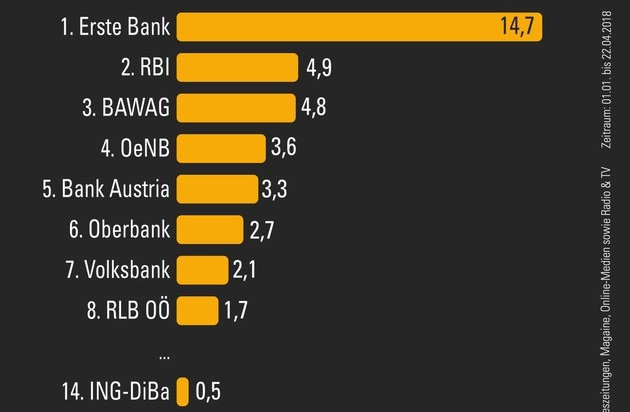 Die Erste Bank kommt mit einem Präsenzindex (Anzahl der Nennungen in Medien in Relation zur Gesamtberichterstattung und gewichtet nach der Intensität der Nennung) von fast 15 auf die dreifache Sichtbarkeit wie RBI und BAWAG, die mit jeweils knapp 5 Punkten auf den Rängen zwei und drei folgen. Alle drei profitieren als börsennotierte Unternehmen auch von der regelmäßigen Quartalsberichterstattung.