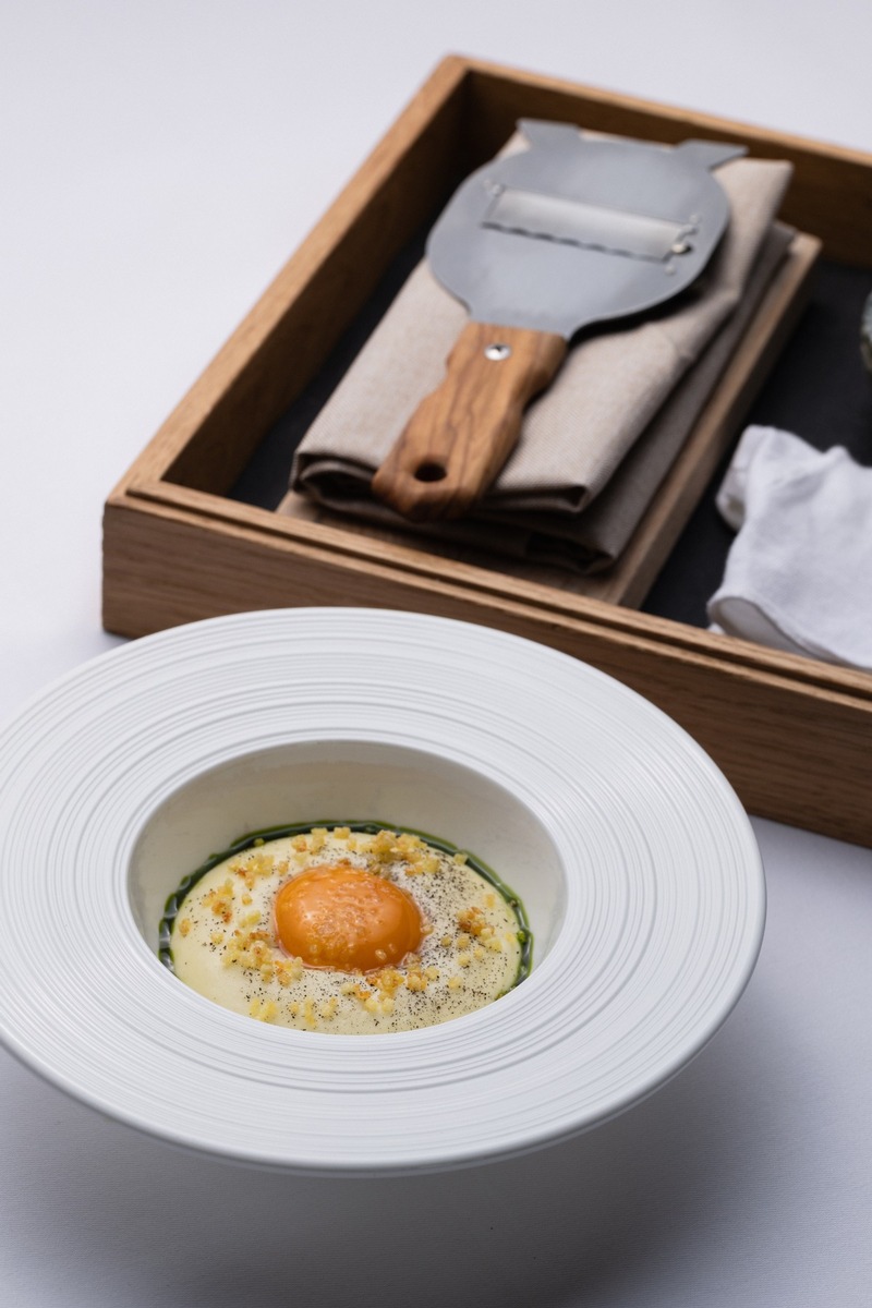 Zu seinen Signature Dishes zählt die Steffisburger Kartoffel, eine Hommage an seine Herkunft mit grosser Wirkung: Konfiertes Eigelb, Lauch und Trüffel verbinden sich mit der Kartoffel zu einer cremigen Komposition, die kulinarische Finesse zeigt. Nichts an diesem Teller wirkt überladen, alles ist klar und präzise aufeinander abgestimmt. Es ist der Geschmack von Bodenständigkeit als stilles Bekenntnis zum Handwerk und einwandfreien Produkten.