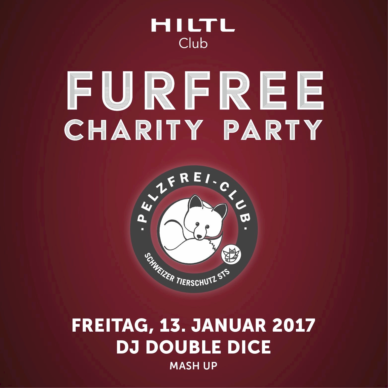 Am Freitag, 13. Januar findet im ersten Pelzfrei-Club der Schweiz, dem Hiltl Club, in Zusammenarbeit mit dem Schweizer Tierschutz STS ab 23 Uhr die Furfree Charity Party statt. Jeder Gast bestimmt seinen Eintrittspreis selber und die Einnahmen werden vollumfänglich dem Anti-Pelz-Projekt des STS gespendet, das sich gegen die qualvolle Ausbeutung von Tieren auf Pelzfarmen einsetzt. Am Set führt DJ Double Dice die ganze Nacht im Sinne des Mash Up durch die verschiedenen Genres. Ebenfalls mit von der Party werden prominente Vertreter der Anti-Pelz-Bewegung sein.