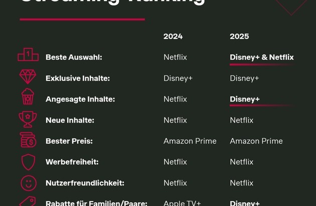 "Disney+ holt sich 2025 die Content-Krone", sagt Lisa Jäger, Partnerin bei Simon-Kucher. "Content ist King und Disney+ hat das verstanden. Netflix liegt nicht mehr unangefochten an der Spitze des deutschen Streamingmarkts!" Und das obwohl Netflix erneut sechs Kategorien gewinnt, unter anderem "Userfreundlichkeit", "Neue Inhalte" und "Werbefreiheit".