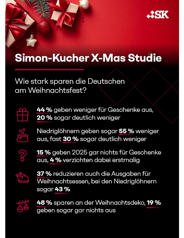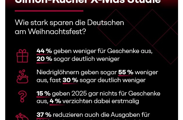 Weihnachten auf Sparkurs! Laut der Simon-Kucher X-Mas-Studie sinken die Ausgaben der Deutschen für Weihnachtsgeschenke erheblich. Fast die Hälfte der Menschen hierzulande gibt 2025 weniger Geld für Weihnachtsgeschenke aus, rund ein Sechstel der Menschen streicht das Budget sogar komplett. Auch beim Essen wird gespart: Mehr als ein Drittel will die Kosten für das Weihnachtsessen senken, jeder zehnte Deutsche streicht das Budget fürs Weihnachtsessen gleich ganz. Besonders stark betroffen: Niedriglöhner. Hier sparen 2025 rund vier von zehn Menschen am Festmahl.