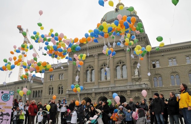 Für kurze Zeit gehörte heute Nachmittag der Berner Bundesplatz ganz den Familien: Es wimmelte von Kinderwagen, Ballonen, spielenden Kindern und Eltern. Sie versammelten sich auf Einladung von Pro Juventute, um auf die Abstimmung über den Familienartikel vom kommenden Sonntag aufmerksam zu machen. Als Höhepunkt der Versammlung liessen die Familien Hunderte von Ballonen in den Himmel steigen. Daran befestigt rufen Karten das Stimmvolk auf, am 3. März an der Urne ein 'Ja' einzulegen zum Familienartikel.