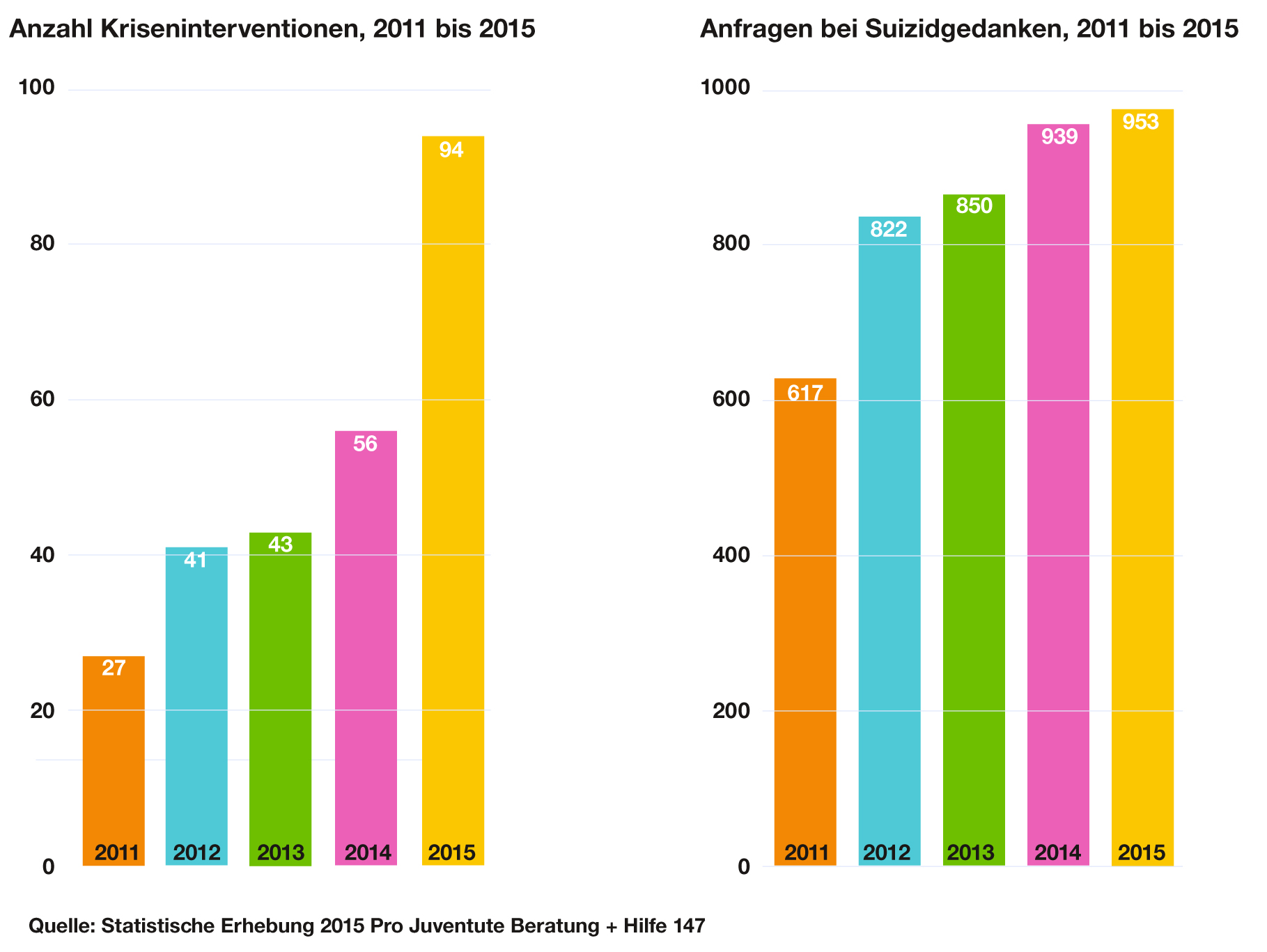 Durch den täglichen intensiven Kontakt zu Kindern und Jugendlichen erfährt das Team der Notrufnummer 147 hautnah, welche Themen Kinder und Jugendliche in der Schweiz beschäftigen. Im Vergleich über die letzten 5 Jahre zeigen sich deutliche Veränderungen: am stärksten zugenommen haben Anfragen zu persönlichen Problemen (2015: 22,9% aller Anfragen, 2011: 15.5%). Dabei insbesondere Themen wie psychische Erkrankungen und depressive Stimmung, Essstörungen, persönliche Krisen oder das Selbstwertgefühl. Und auch Anrufe von Jugendlichen zum Thema Suizid nahmen in den letzten Jahren kontinuierlich zu auf fast 1'000 Jugendliche in 2015 - das sind jeden Tag zwei bis drei Jugendliche und gegenüber 2011 eine Zunahme um mehr als 50% (2015: 953 Anrufe, 2011: 617). 94 Mal mussten die Beraterinnen und Berater gar unmittelbare Kriseninterventionen via Polizei, Ambulanz oder psychiatrische Dienste auslösen, da das Leben oder die Gesundheit eines Kindes oder Jugendlichen akut gefährdet war. Das ist eine Verdreifachung an Kriseninterventionen seit 2011 (2011: 27 Interventionen, +248%).