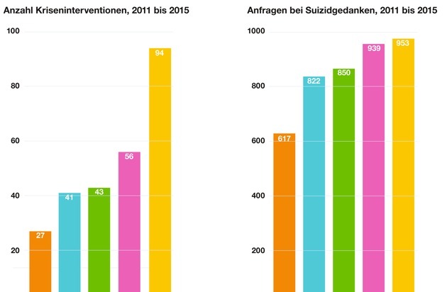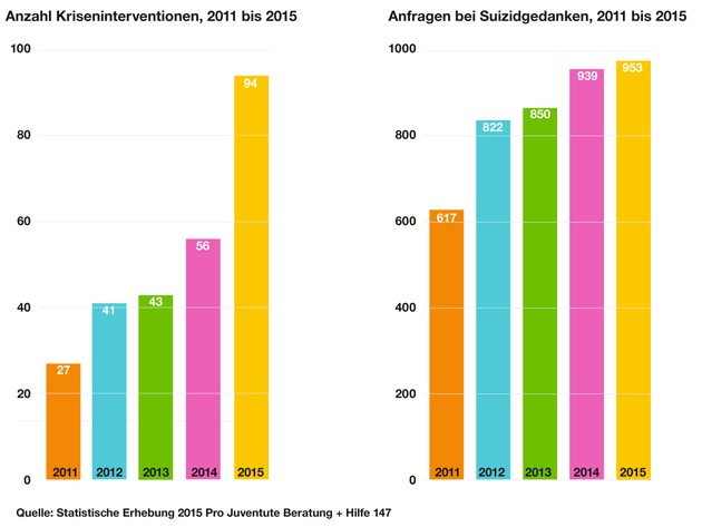 160'000 Mal wendeten sich Kinder und Jugendliche im letzten Jahr an die kostenlose und vertrauliche Beratung + Hilfe 147 von Pro Juventute. Die heute veröffentlichten Zahlen zeigen: das 70-köpfige Beratungsteam erhielt 2015 deutlich mehr Anfragen zu schwerwiegenden persönlichen Problemen als noch vor fünf Jahren. Jeden Tag wenden sich zwei bis drei Jugendliche mit ernsthaften Fragen zum Thema Selbsttötung und teils ganz konkreten Absichten an die Notrufnummer 147. Die Anfragen zum Thema Suizid haben dabei seit 2011 um 50 Prozent zugenommen. Zudem waren deutlich mehr Kriseninterventionen nötig. Während im Jahr 2011 27 Mal Ambulanz, Polizei oder psychiatrische Dienste aufgeboten werden mussten, um Kindern und Jugendlichen in akuten Notsituationen zu helfen, waren es 2015 bereits 94 Kriseninterventionen.