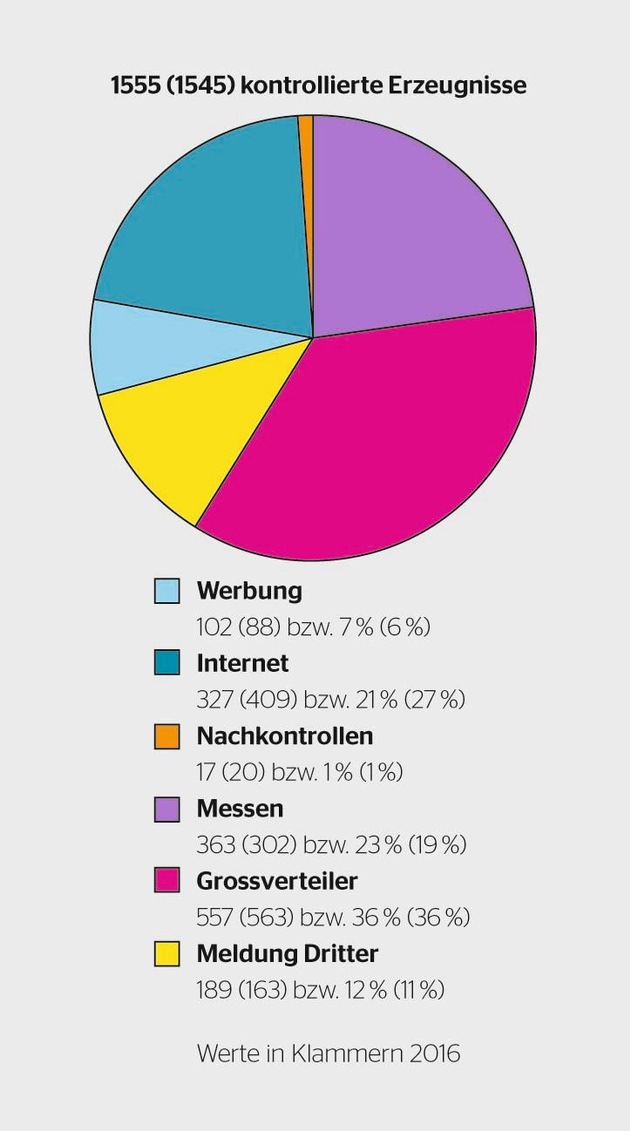 1555 überprüfte Erzeugnisse wurden anlässlich von Besuchen bei Grossverteilern, Fachmärkten, Herstellern, Messen sowie bei Kontrollen auf Websites und in Printmedien erfasst. Überprüfungen erfolgten auch aufgrund von Meldungen von Konsumenten, Mitbewerbern sowie Fachpersonen aus dem Elektrobereich.