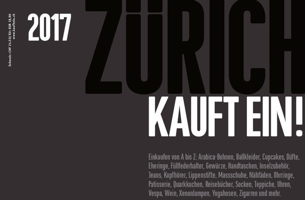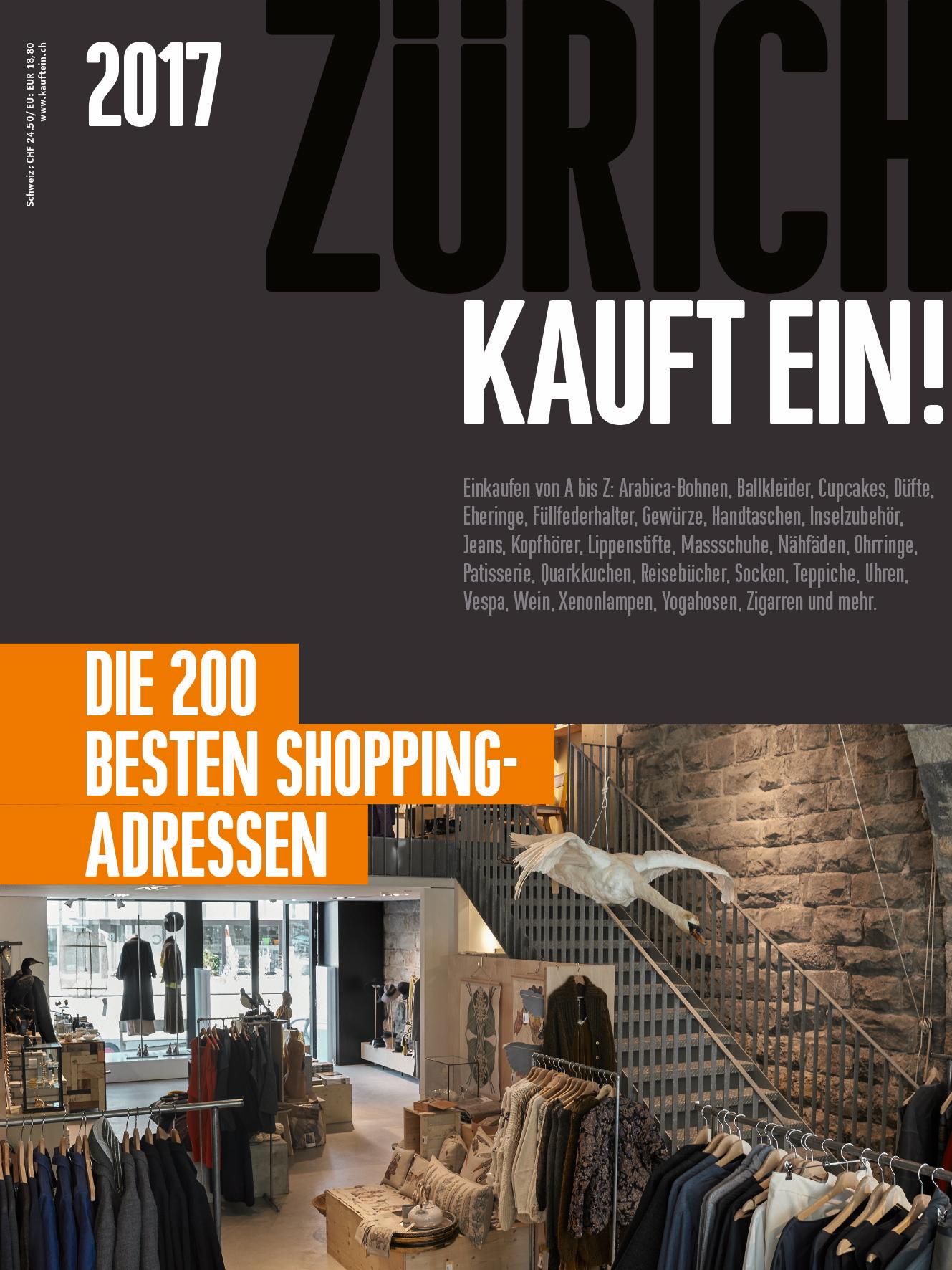 In ZÜRICH KAUFT EIN! 2017 finden Sie alles zum Thema Einkaufen. Von A bis Z: Alpkäse, Blumen, Couture, Duftkerzen, Entenleber, Flipflops, Gläser, Handtaschen, Instrumente, Jeans, Kabelbinder, Lampen, Modellflugzeuge, Nigiri, Ohrringe, Plaids, Quarktaschen, Rucksäcke, Schokolade, Tische, Uhren, Velos, Wein, Xenonlampen, Yogamatten, Zahnpasta und mehr.