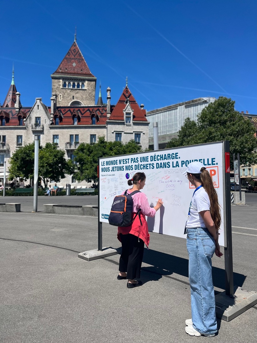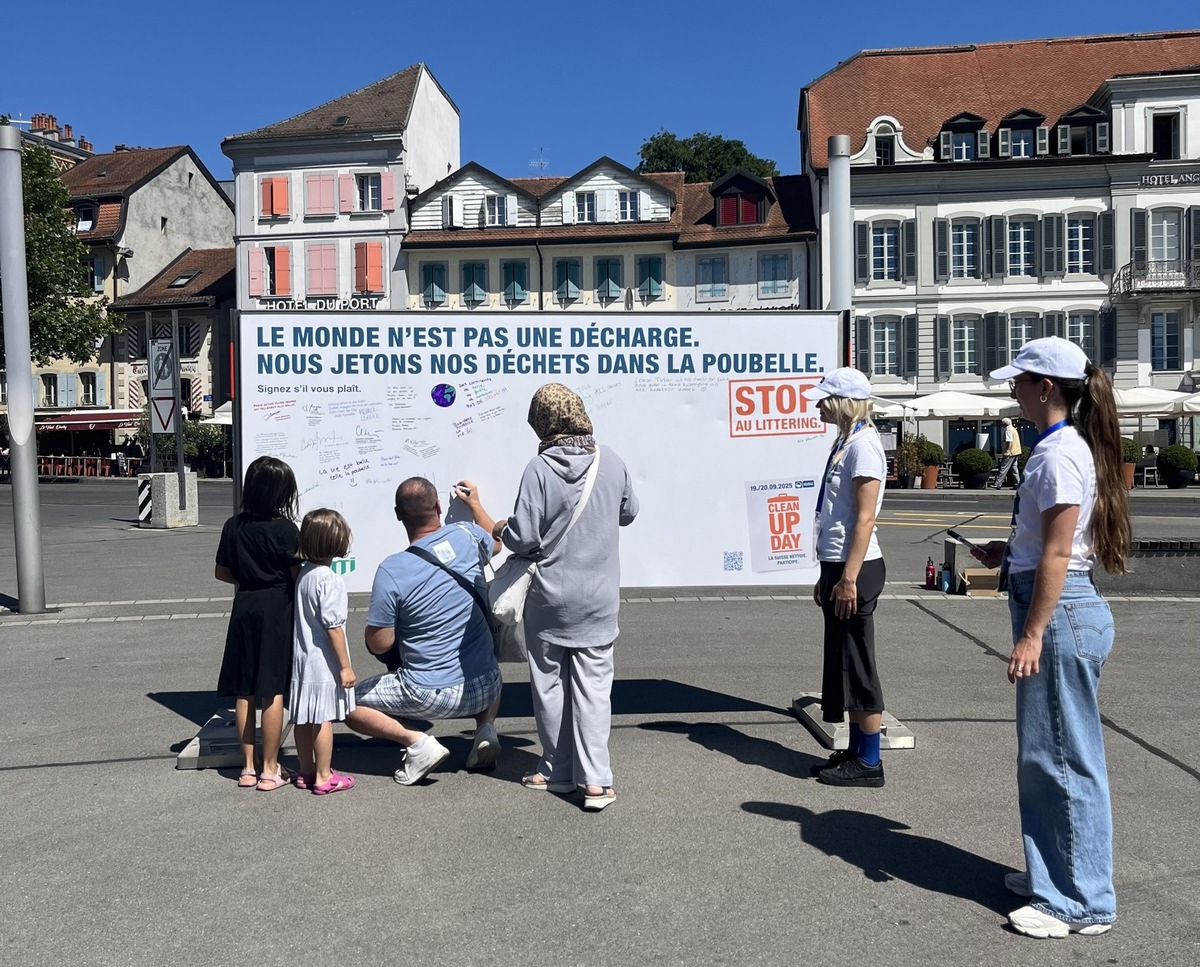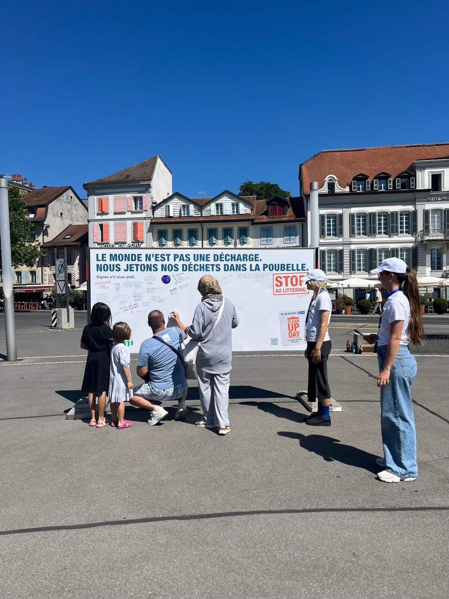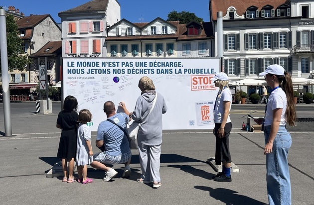 Des discussions intéressantes ont également eu lieu aujourd’hui à Lausanne: sur la place du Vieux-Port, les équipes d’ambassadeurs et d’ambassadrices de l’IGSU ont invité les passants et les passantes à s’exprimer contre le littering en apposant leurs signatures, slogans ou illustrations sur une affiche blanche. «La plupart des personnes qui passent par là se rendent au lac», explique Cédric Québatte, responsable des équipes d’ambassadeurs de l’IGSU. «Il est particulièrement important d’éliminer les déchets correctement à proximité d’un plan d’eau. En effet, les déchets qui finissent dans l’eau ne seront pas ramassés par les équipes de nettoyage. Mais avec leurs slogans et leurs illustrations, la population de Lausanne a prouvé qu’un environnement propre lui tenait à cœur.»