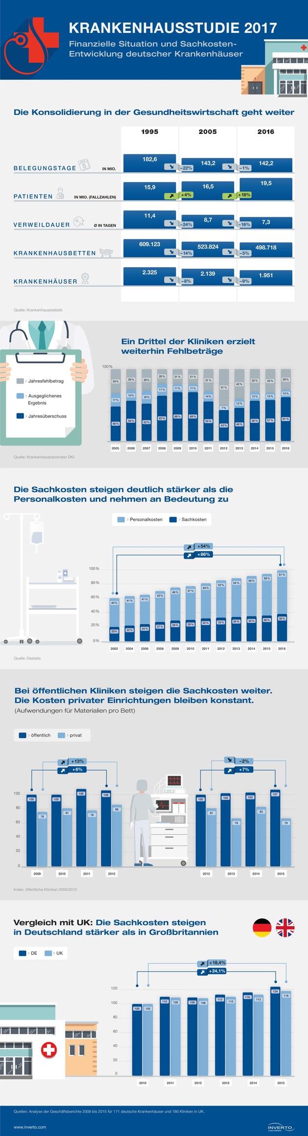 Der Kostendruck auf Krankenhäuser in Deutschland wird in den kommenden Jahren steigen. Hintergrund ist das Krankenhausstrukturgesetz, dessen Auswirkungen jetzt spürbar werden. Da Sachkosten in den vergangenen Jahren neben den Personalkosten die größten Kostentreiber waren, sollten Krankenhäuser ihren Einkauf optimieren, um Einsparpotenziale zu realisieren. Das ist das zentrale Ergebnis einer Studie zur Entwicklung der Sachkosten in Krankenhäusern der Unternehmensberatung INVERTO.