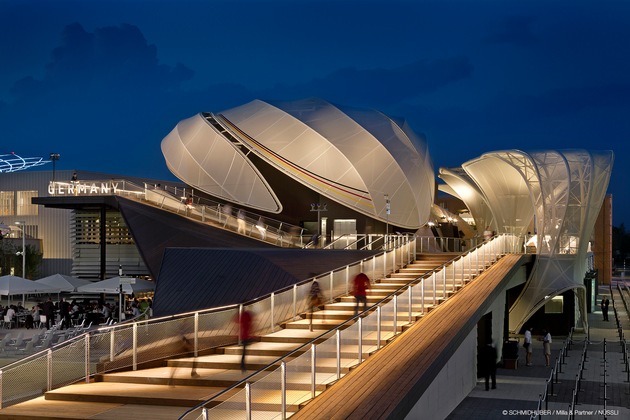 Der Deutsche Pavillon ist als eine offene, frei begehbare Landschaft gestaltet und trägt den Titel "Fields of Ideas". Geerntet werden auf diesem Feld allerdings weder Getreide noch Gemüse, sondern eine Vielzahl fruchtbarer Ideen, Inspirationen und Energien. Zentrales Gestaltungselement des Pavillons sind stilisierte Pflanzen, die als "Ideen-Keimlinge" aus der Ausstellung himmelwärts wachsen. Die Blätterdächer dieser so genannten Solar Trees bergen organische Photovoltaik-Module, deren Sonnenenergie vom Hager Energiespeichersystem aufgefangen und zur Beleuchtung weitergegeben wird.