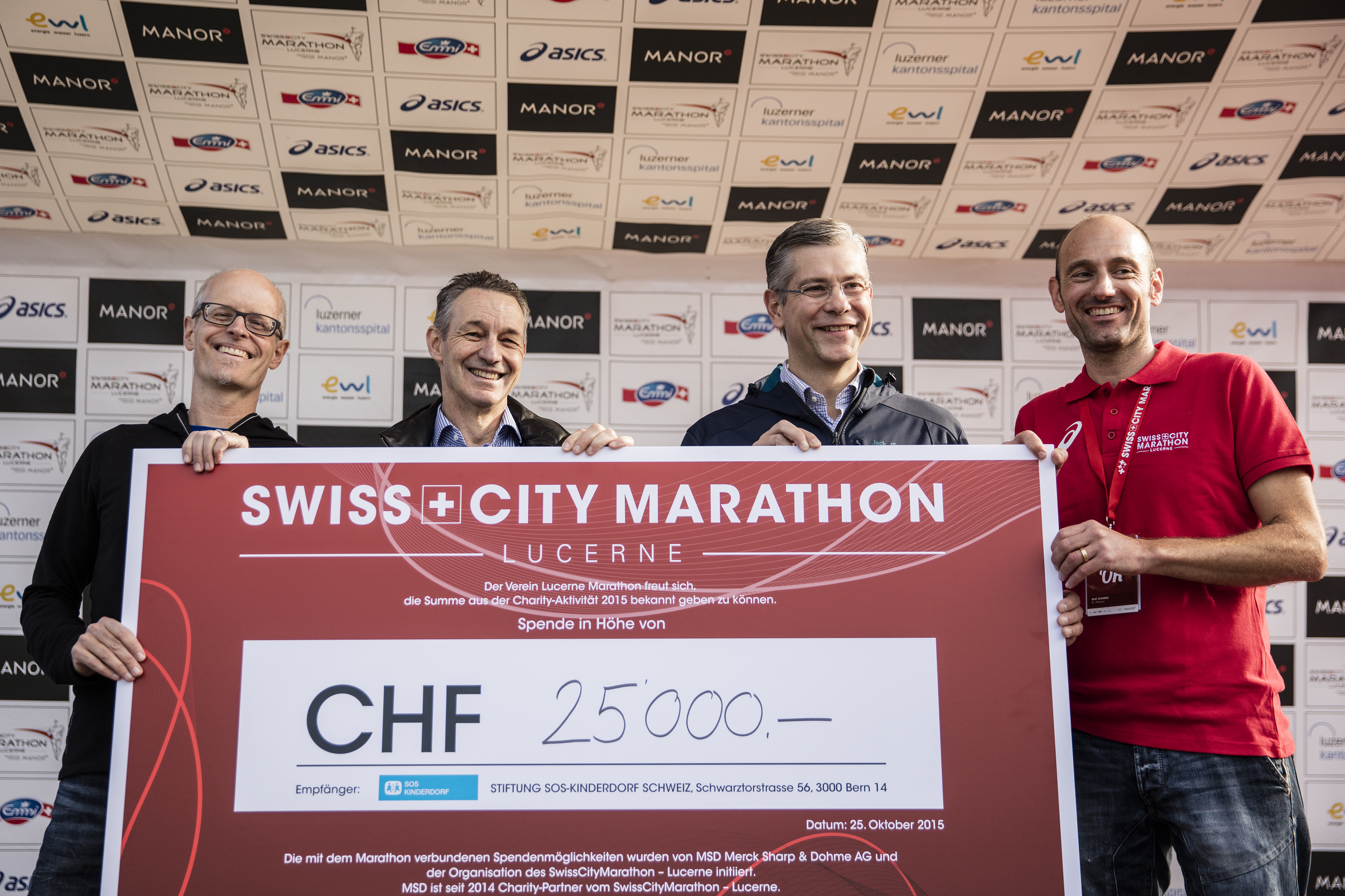 Der Spendenbertrag setzt sich aus den Charity-Teilnehmerbeiträgen zusammen, aus Online- und direkten Firmen- und Individualspenden sowie einem zusätzlichen Betrag des Charity-Partners MSD. Der Erlös von insgesamt 25'000 Schweizer Franken geht an das medizinische Zentrum von SOS-Kinderdorf in Dosso, Niger (siehe Infobox). Mit diesem Engagement reiht sich der SwissCityMarathon Lucerne in die Gruppe grosser, internationaler Läufe ein, bei welchen der soziale Gedanke eine bedeutende Rolle spielt. MSD bedankt sich bei allen Charity-Läuferinnen und -Läufern, den Firmenspendern sowie allen privaten Spenderinnen und Spendern unter den Zuschauern und Fans für deren grossartige Unterstützung.
