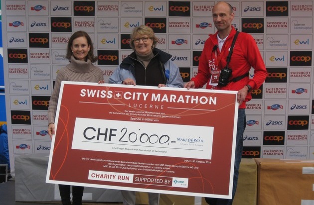 Läuferinnen und Läufer aller Kategorien konnten sich dieses Jahr wieder an den Charity-Aktivitäten beteiligen. Mit den 2014 vom forschenden Gesundheitsunternehmen MSD und von SwissCityMarathon Lucerne initiierten Möglichkeiten zur Wohltätigkeit, ist dieses Jahr ein Betrag von insgesamt 20'000 Franken zusammen gekommen. Der Erlös geht an die Stiftung Make-A-Wish Schweiz. Die gemeinnützige Organisation erfüllt Herzenswünsche schwer kranker Kinder.