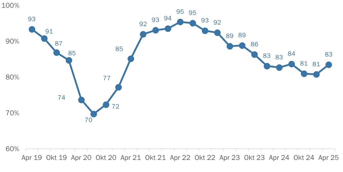Der Aufschwung, auf den viele nach zwei schwierigen Jahren hoffen, bleibt aus. Besonders deutlich zeigt sich der Druck bei der Margenentwicklung, die nun seit elf Quartalen rückläufig ist. Die Investitionstätigkeit leidet entsprechend: Zwar plant knapp ein Drittel der Unternehmen eine Erweiterung der Produktionskapazitäten, aber bei rund 20 Prozent verhindern finanzielle Einschränkungen Investitionen – oft aufgrund fehlender Eigenmittel.