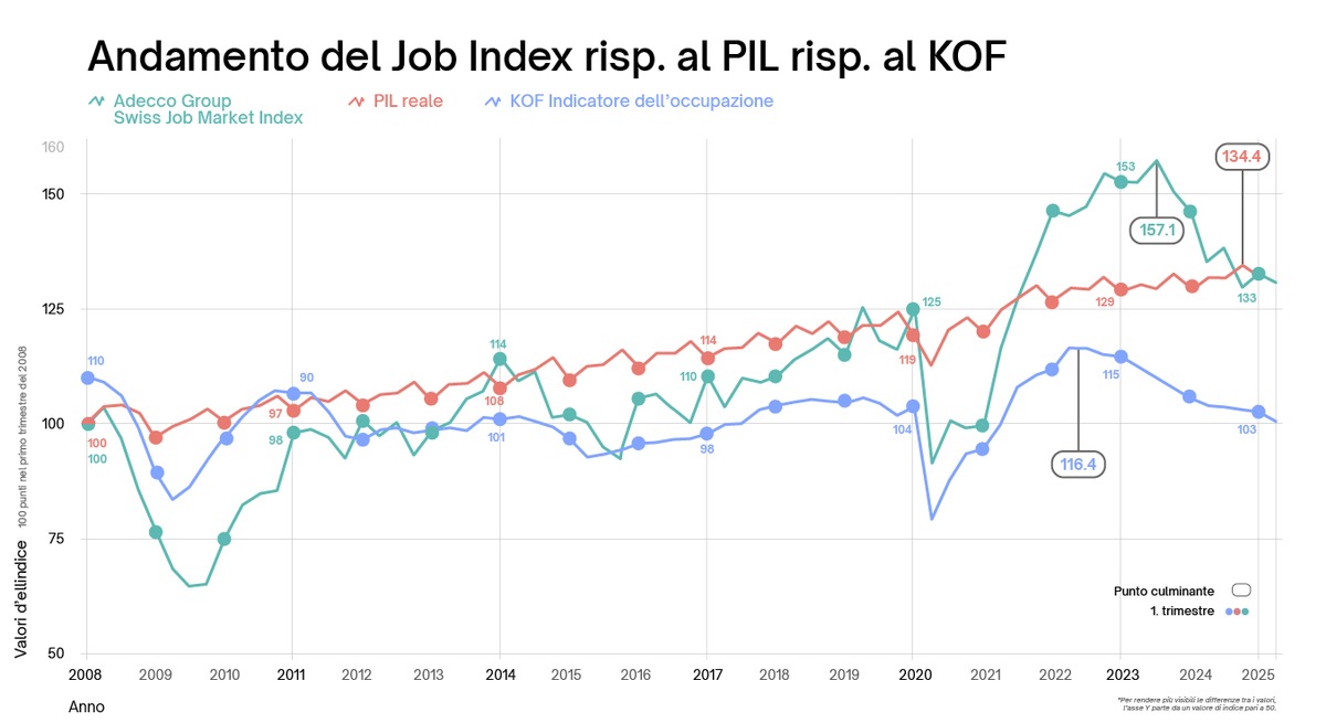Informazioni sull’Adecco Group Swiss Job Market Index (Job Index) In collaborazione con il Stellenmarkt-Monitor Schweiz, il servizio di monitoriaggio del mercato del lavoro svizzero presso l’Istituto di sociologia dell’Università di Zurigo, il Gruppo Adecco Svizzera pubblica l’Adecco Swiss Group Job Market Index (Job Index) su base trimestrale. Il Job Index fornisce alla Svizzera un indicatore di riferimento scientificamente fondato e completo per l’evoluzione delle offerte di lavoro nei portali di lavoro online e nei siti web aziendali. Esso si basa su indagini trimestrali rappresentative delle offerte di lavoro sulla stampa cartacea, sui portali di lavoro online e sui siti web delle aziende. Informazioni sul Gruppo Adecco Svizzera Il Gruppo Adecco Svizzera è leader nel mercato svizzero delle risorse umane. Con oltre 700 dipendenti in più di 50 sedi in tutte le regioni linguistiche, ogni anno aiutiamo circa 26'000 lavoratori qualificati a cogliere nuove sfide professionali. Offriamo soluzioni su misura per le piccole, medie e grandi imprese nella gestione del personale: collocamento a tempo indeterminato, collocamento temporaneo, servizi di payroll, outsourcing e outsourcing di interi processi Human Resources, pianificazione delle carriere, sviluppo e mobilità dei talenti. In Svizzera siamo rappresentati dai seguenti marchi: Adecco, Adia, Akkodis, Pontoon Solutions, Lee Hecht Harrison e General Assembly. Il Gruppo Adecco Svizzera è una società del Gruppo Adecco, leader a livello globale per Talent Advisory e Solutions. Siamo profondamente convinti di poter far sì che tutti siano in forma per il futuro e impieghiamo più di 3,5 milioni di persone quotidianamente. Reclutiamo, sviluppiamo e creiamo talenti in 60 Paesi, permettendo alle organizzazioni di contribuire a plasmare il futuro del lavoro. Il Gruppo Adecco ha la sua sede principale a Zurigo, in Svizzera, (ISIN: CH0012138605) ed è quotato alla SIX Swiss Exchange (ADEN).