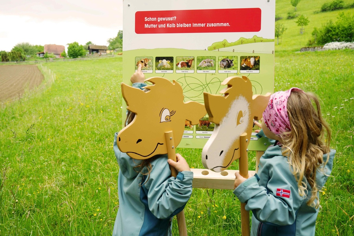 Die Gemeinde Freienstein-Teufen hat sich ihren ländlichen Charakter trotz Stadtnähe bewahren können. Schöne Riegelbauten, die alte Römerbrücke, das Schloss Teufen und die Ruine Freienstein verleihen dem Dorf im Zürcher Unterland einen besonderen Charme. Mit dem Erlebnisweg wird die Gemeinde nun noch um eine Attraktion reicher. Elf lehrreiche Posten sorgen für Spiel und Spass. Zusammen mit Lea und Ben, den Figuren aus den gleichnamigen Kinderbüchlein von Mutterkuh Schweiz, gilt es diverse Aufgaben zu lösen. So können Interessierte beispielsweise beim Abfallzielwurf Leben retten und beim Kuh-Kalb-Stier-Polo spielend lernen, was Mutterkühe hauptsächlich fressen. Plus wird die Frage beantwortet, wie man auch mit einem kleinen Haushaltsbudget gutes Fleisch einkaufen kann, ohne dabei das Tierwohl ausser Acht zu lassen. Zudem lernen die Besucherinnen und Besucher die drei Hauptregeln für die Durchquerung einer Weide kennen: erstens Tiere grossräumig umgehen, zweitens nie ein Kälbchen streicheln und drittens den Hund an der kurzen Leine führen. Am Schluss des Erlebnisweges können die Kinder erst noch ein Büchlein von Lea und Ben mit nach Hause nehmen.