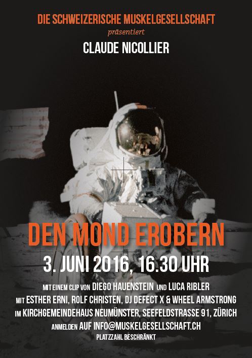 16.30 Uhr Einlass und Apéro 17.00 Uhr Begrüssung durch die Muskelgesellschaft 17.15 Uhr Launch neue Website und Premiere Videoclip «Den Mond erobern» Persönliche Erfahrungen von und mit: Esther Erni, Rolf Christen - Betroffene Wheel Armstrong Diego Hauenstein, Luca Ribler - Regisseure 18.00 Uhr Claude Nicollier - Schritte im Weltraum Erster und einziger Schweizer im Weltraum 18.50 Uhr Fragen 19.30 Uhr Ende offizieller Teil