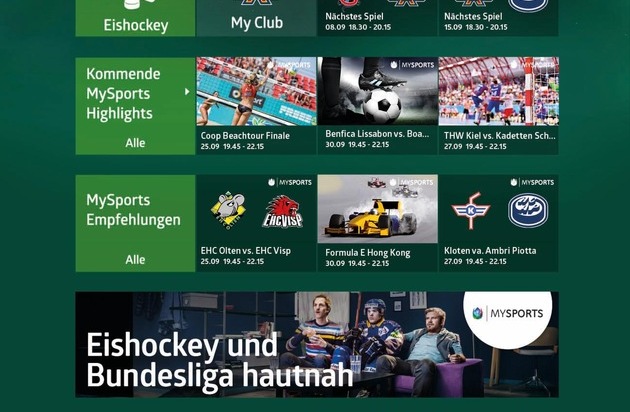 «MySports», der neue Sportsender der Kabelnetzbranche, nimmt vom Start weg eine führende Rolle in der Schweiz ein. Das Angebot umfasst Eishockey, Bundesliga/Sky und etliche weitere Sportarten. Die Premium-Version "MySports Pro" kostet bei Quickline monatlich überschaubare 25 Franken und ist damit rund 50% günstiger als das bisherige vergleichbare Angebot für Teleclub-Kabelkunden. Bis Ende Oktober wird «MySports Pro» zudem allen Kunden kostenlos zum Kennenlernen angeboten. Der Basissender "MySports HD" ist im Quickline-Gebiet ohne Zusatzkosten für alle TV-Kunden und ohne zusätzliches Empfangsgerät verfügbar. Bei Quickline ist «MySports» darüber hinaus mit weiteren Sportangeboten auf der neuen TV-Plattform angereichert und persönlich inszeniert.