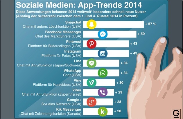 Grafiken liefern die wichtigsten Informationen und Hintergründe auf einen Blick. Seit mehr als 60 Jahren versorgt dpa-infografik, ein Tochterunternehmen der Nachrichtenagentur dpa, Medien, Unternehmen, Regierungen, Verbände und Bildungseinrichtungen mit spannenden Schaubildern zu den großen Themen aus Politik, Wirtschaft, Gesellschaft und Kultur. Monatlich veröffentlichen wir ein Highlight aus dem umfangreichen Angebot der dpa-infografik im Presseportal als "Grafik des Monats". Diesen Monat geht es um ein IT-Thema: "Soziale Medien: App-Trends 2014".