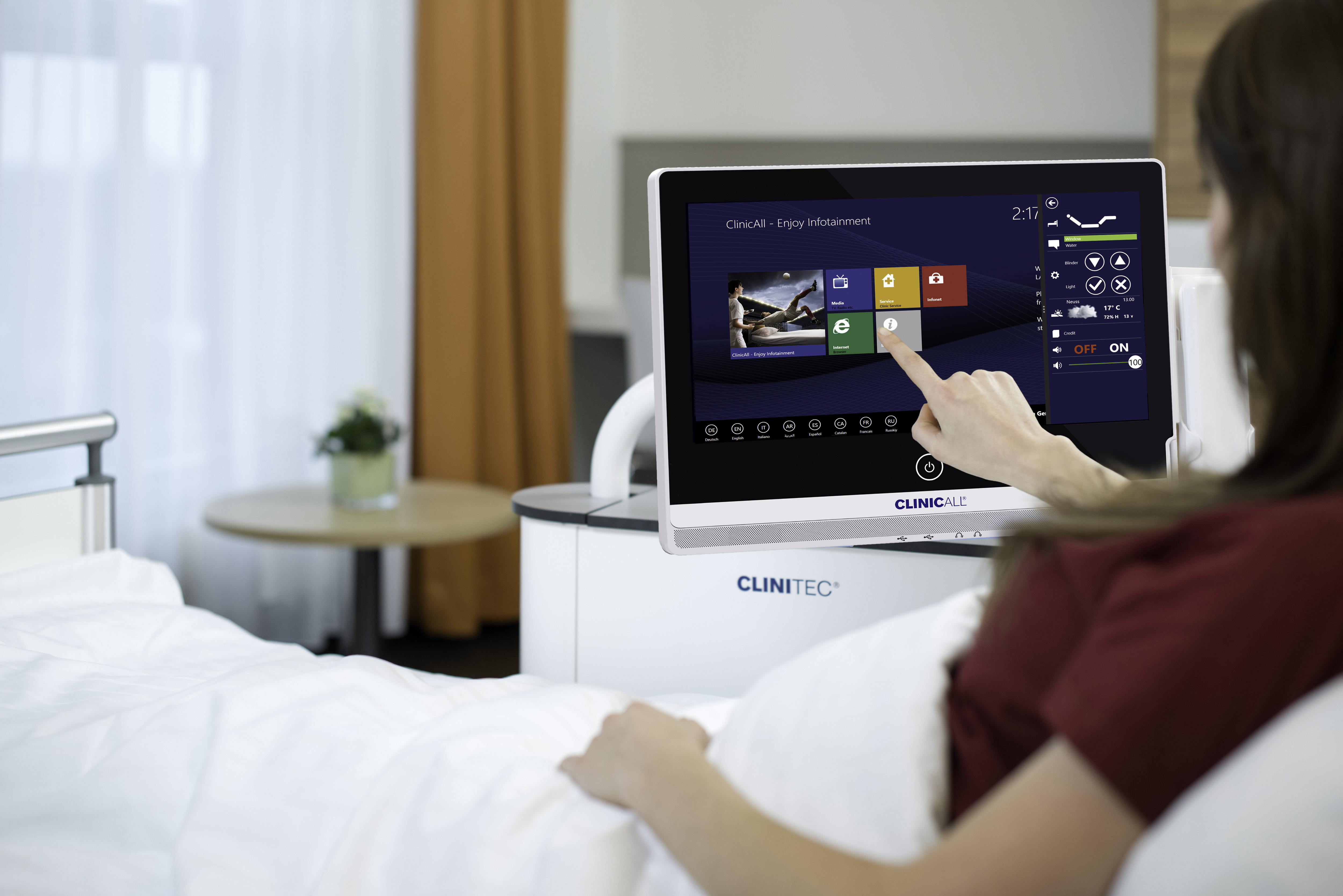 Das an einem Schwenkarm montierte 15-Zoll-Multitouch-Terminal am Krankenbett lieben die Patienten der Universitätsklinik Golnik. Die seit Herbst 2015 installierten Geräte des Anbieters ClinicAll stellen ihnen viele unterhaltsame Angebote zur Verfügung mit denen sich der Aufenthalt im Krankenhaus kurzweiliger gestalten lässt.