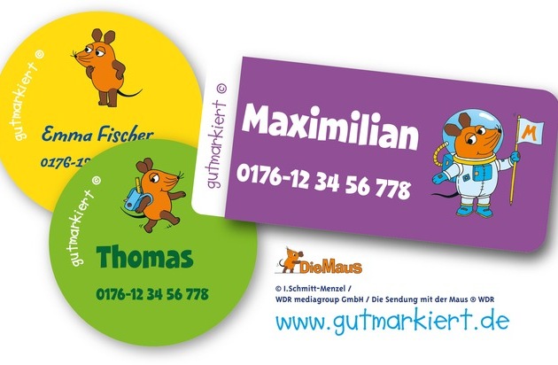 Seit 2003 macht das Unternehmen "Gutmarkiert" die Besitztümer von Kindern unverwechselbar: Personalisierte bunte Aufkleber und Bügeletiketten für alles, was jedes Kind gerne verliert oder verwechselt. Dank einer neuen Kooperation mit dem WDR bringt "Gutmarkiert" die widerstandsfähigen Sticker jetzt erstmalig mit den Symbolen der Maus, dem Elefanten und der Ente auf den Markt. Durch Symbole können auch schon kleine Kinder, die noch nicht lesen können, die eigenen Sachen wiedererkennen.