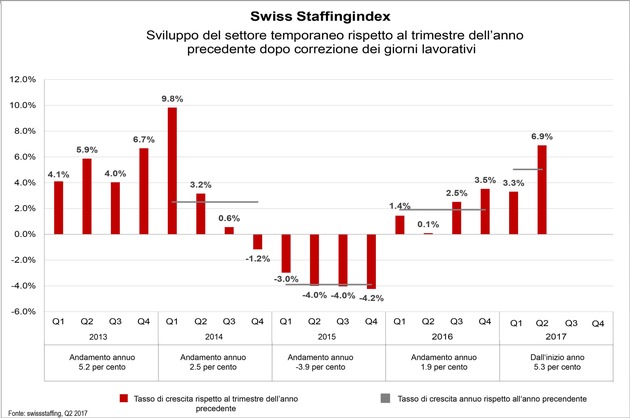 «Nel bilancio semestrale, il settore del lavoro temporaneo registra un aumento delle ore di lavoro prestate del 5,3%.», rileva Marius Osterfeld, economista presso swissstaffing. «A fronte della buona congiuntura mondiale e delle prospettive positive di crescita, il settore può dunque guardare con sguardo positivo alla seconda metà dell'anno.» Ciò nonostante bisogna procedere con umiltà. «Il franco tutt'ora forte e l'importante aumento dei salari reali potrebbero compromettere la lieve ripresa. Aumenti salariali in blocco realizzati tramite contratti collettivi di lavoro vanno considerati con cautela e riserbo. La buona situazione economica offre ad ogni collaboratore ed ad ogni collaboratrice una vasta gamma di possibilità per migliorare la propria situazione finanziaria e professionale.»
