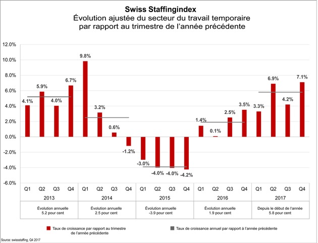 En 2017, le travail temporaire a permis de créer plus de 5 000 emplois en Suisse. Par rapport à l'année précédente, le nombre d'heures travaillées a augmenté de 5,8 %. Après deux années de crise, le secteur envoie ainsi un signal positif de développement économique global: au début de toute phase de croissance, les entreprises ont par expérience recours à des travailleurs temporaires afin de gérer la hausse de leurs commandes. Une croissance solide est donc attendue en Suisse en 2018.