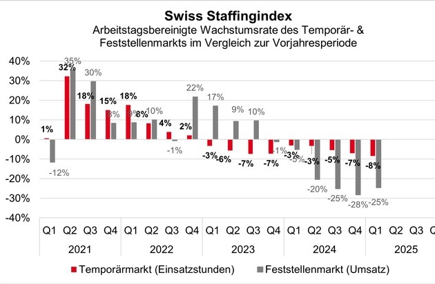 Die Personaldienstleister sind im ersten Quartal negativ in das Jahr 2025 gestartet. Auf dem Temporärmarkt beginnt das Geschäftsjahr zum dritten Mal in Folge mit roten Zahlen. Im Personalverleih fielen die geleisteten Einsatzstunden um 8,4 Prozent. Der Feststellenmarkt brach um 24,6 Prozent ein. Damit spüren die Personaldienstleister, als traditionell konjunktursensitive Branche, die wirtschaftliche Unsicherheit besonders stark. Die US-Zollpolitik unter dem aktuellen Präsidenten Donald Trump befeuert diese Entwicklung in einer Phase, in der sich die Konjunktur ohnehin abkühlt und die geopolitischen Risiken gross bleiben.