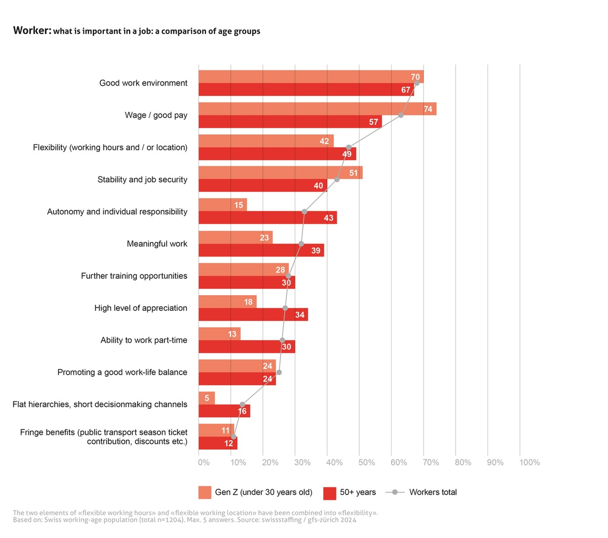 Swiss workers consider the work environment to be the most important criteria in a job - even more so than pay. This surprising choice of priorities is the finding of a representative study by swissstaffing and gfs-zürich, which surveyed 1204 people of working age. The results display clear differences between generations: while Generation Z is looking for security, older workers want greater autonomy, flexibility and purpose. Notably, employers often set priorities that conflict with the working population's needs. This is the finding of a survey of 509 Swiss companies.
