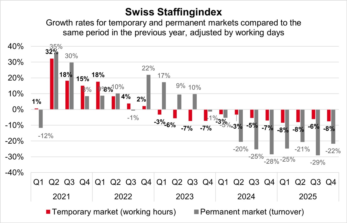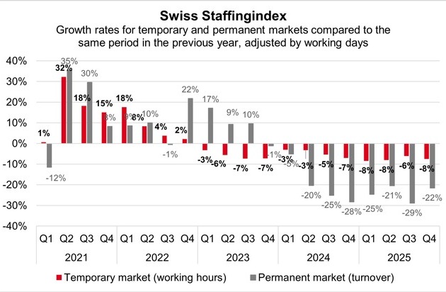 Swiss staffing service providers were affected by significant economic slowdown in 2025. This is due in part to US tariff policy, which created months of huge uncertainty in the export industry. This was compounded by lingering economic weakness in Germany, one of Switzerland's most important sales markets. These shocks prompted economic development to generally wane. Given the poor order situation, many companies - especially in industry - have been very cautious in their staff planning. Whilst the lukewarm growth prospects had a particularly strong effect on the permanent staffing sector, the absence of short-term order peaks also had a negative impact on staff leasing. The persistent housing shortage and interest rate cuts by the Swiss National Bank made their impact known in 2025. Business in the construction sector remained stable and prevented a sharper decline - a trend that is likely to continue next year with the abolition of the imputed rental value.