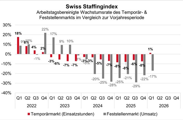 Die Schweizer Personaldienstleister stoppen im 1. Quartal 2026 einen mehrjährigen Abwärtstrend. Nach 12 Quartalen im Minus stiegen die geleisteten Einsatzstunden der Temporärarbeitenden um 1,3 Prozent gegenüber dem Vorjahr. Das Feststellengeschäft leidet hingegen weiter unter der Konjunkturabkühlung und der wirtschaftlichen Unsicherheit. Mit einem Rückgang von 16,9 Prozent fällt das Marktsegment im elften Quartal in Folge. Damit spiegelt der Swiss Staffingindex als Fieberthermometer der Schweizer Wirtschaft die positive Entwicklung von Arbeitsmarkt und Konjunktur wider.