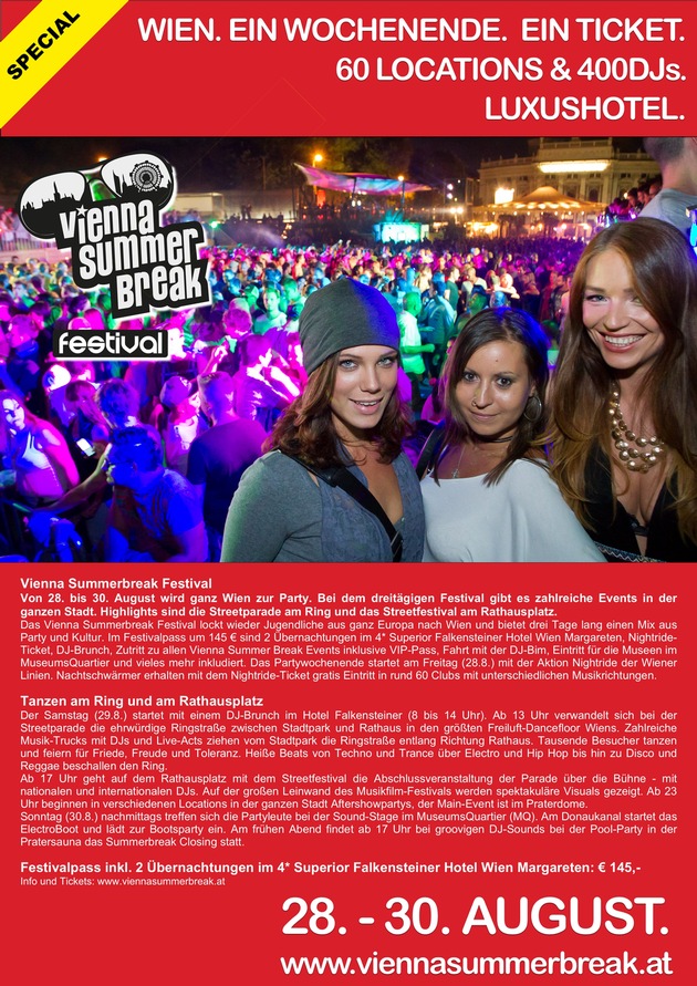 Das VIENNA SUMMERBREAK FESTIVAL nimmt den Sommerausklang zum Anlass, ein dreitägiges Stadtfestival mit zahlreichen Side-Events wie den NIGHTRIDE by Wiener Linien, die Streetparade und das Streetfestival im Herzen Wiens zu veranstalten. Als Highlights erweitern der DJ-Brunch im 4* Superior Falkensteiner Hotel und der Main Eventim Praterdome das umfangreiche Programm. Ein Mix aus Kultur, Musik und guten Parties in rund 60 renommierten Wiener Clubs mit einem facettenreichen DJ Line-Up von knapp 400 DJs wird geboten. Das perfekte Event, um den Sommer nochmals so richtig hochleben zu lassen und zu feiern.