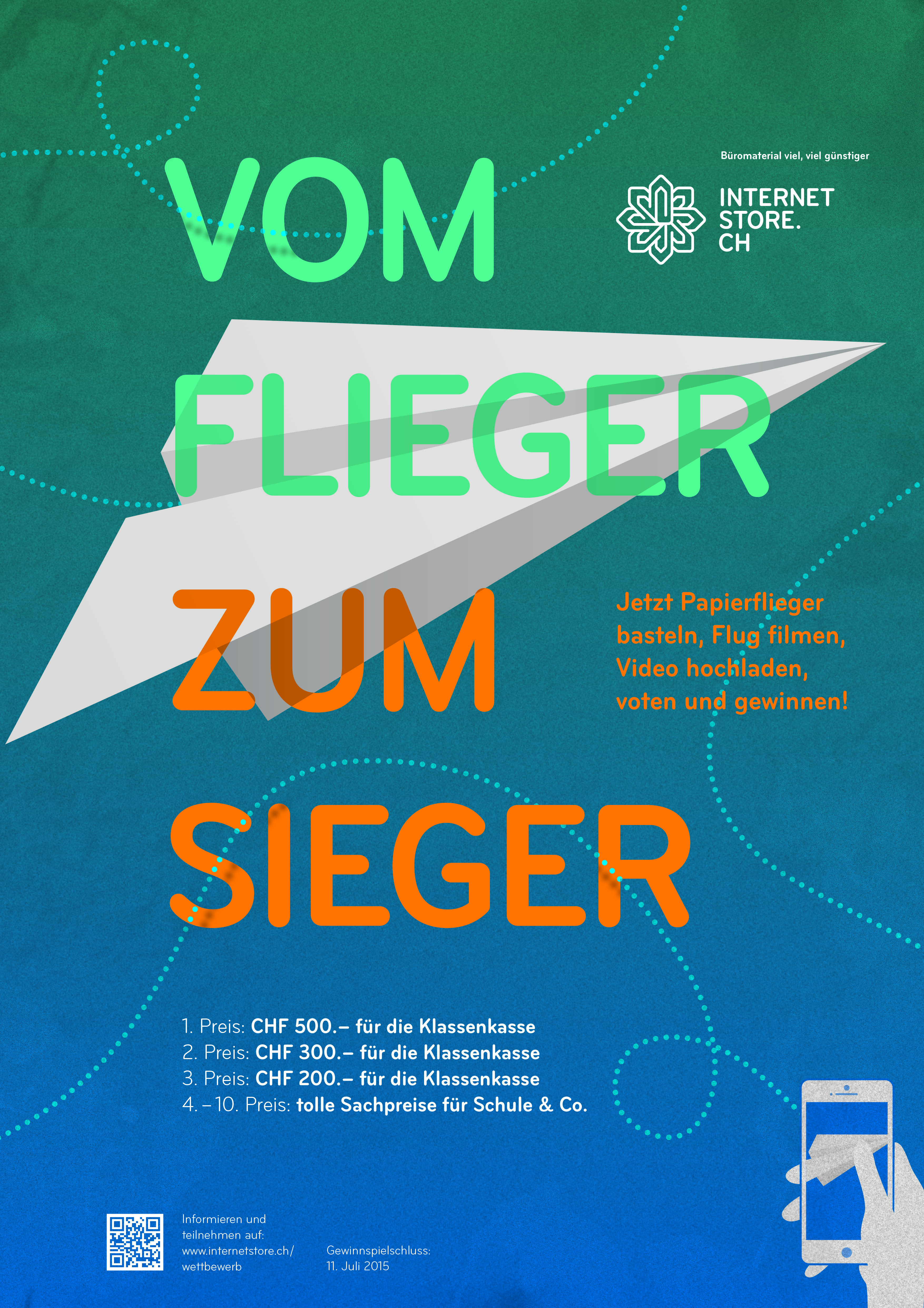 Sein soziales Engagement in Sachen Schule unterstreicht internetstore.ch nun mit einem Wettbewerb, der den Schülern die Zeit bis zu den Sommerferien verkürzen und gleichzeitig den Klassengeist fördern soll. Aufgerufen sind alle Schweizer Schulklassen - von der Primarschule bis zur Hochschule - einen Papierflieger zu basteln, ihn fliegen zu lassen und den Flug mit der Handykamera zu filmen.