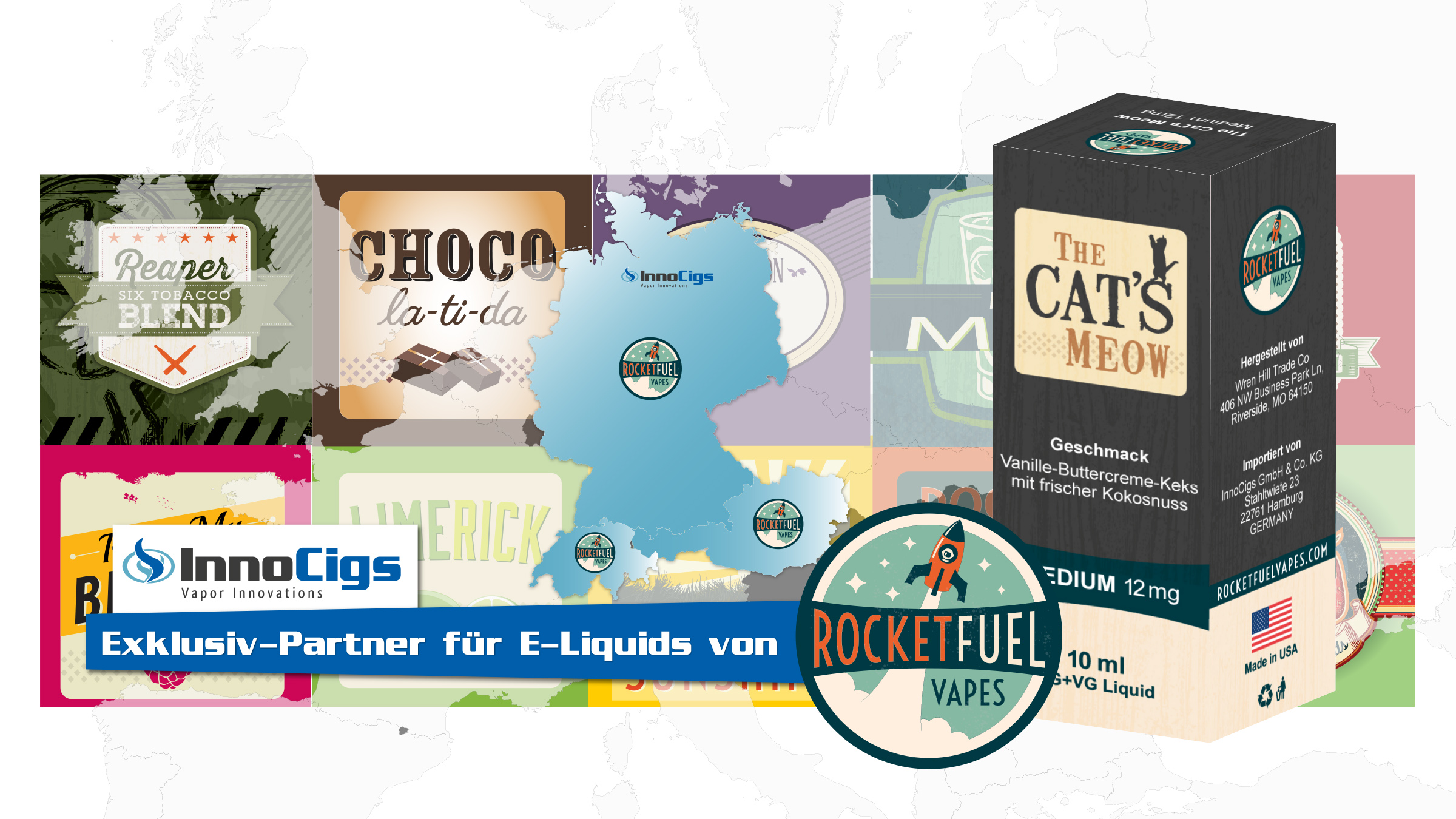 Die amerikanischen Rocket Fuel Liquids sind ab sofort auch im D-A-CH Raum erhältlich. Exklusiver Partner für den Handelsvertrieb der Erfolgsprodukte in Deutschland, Österreich und der Schweiz ist das Hamburger E-Zigaretten Unternehmen InnoCigs.