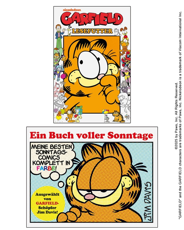 "Garfield - Ein Buch voller Sonntage - Zum 80. Geburtstag von GARFIELD Schöpfer Jim Davis!" - Egmont Comic Collection, EUR 35,00, ISBN 978-3-7704-1033-0 und "Lesefutter - Vollfarbige Garfield Comic-Geschichten", EUR 19,99, ISBN 978-3-7704-0896-2 sind ab sofort im Handel erhältlich und auch unter www.egmont-shop.de