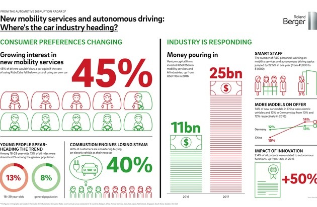 Immer mehr Menschen würden lieber Robotaxis fahren, als ein eigenes Auto zu besitzen: Unter Stadtbewohnern in den USA sind es bereits 40 Prozent, unter jungen Chinesen 26 Prozent. Auch der Anteil der Menschen, die Carsharing, Ridesharing oder Taxis nutzen, steigt: In Deutschland hat er sich in nur einem Jahr verdoppelt. Diese Daten, die die Automobilexperten von Roland Berger für den neuen "Automotive Disruption Radar" weltweit erhoben haben, belegen einen unaufhaltsamen Trend, der die Autoindustrie umkrempeln wird: Mit ihrem traditionellen Geschäftsmodell - dem Verkauf von Neuwagen - wird sie alleine nicht mehr bestehen können.